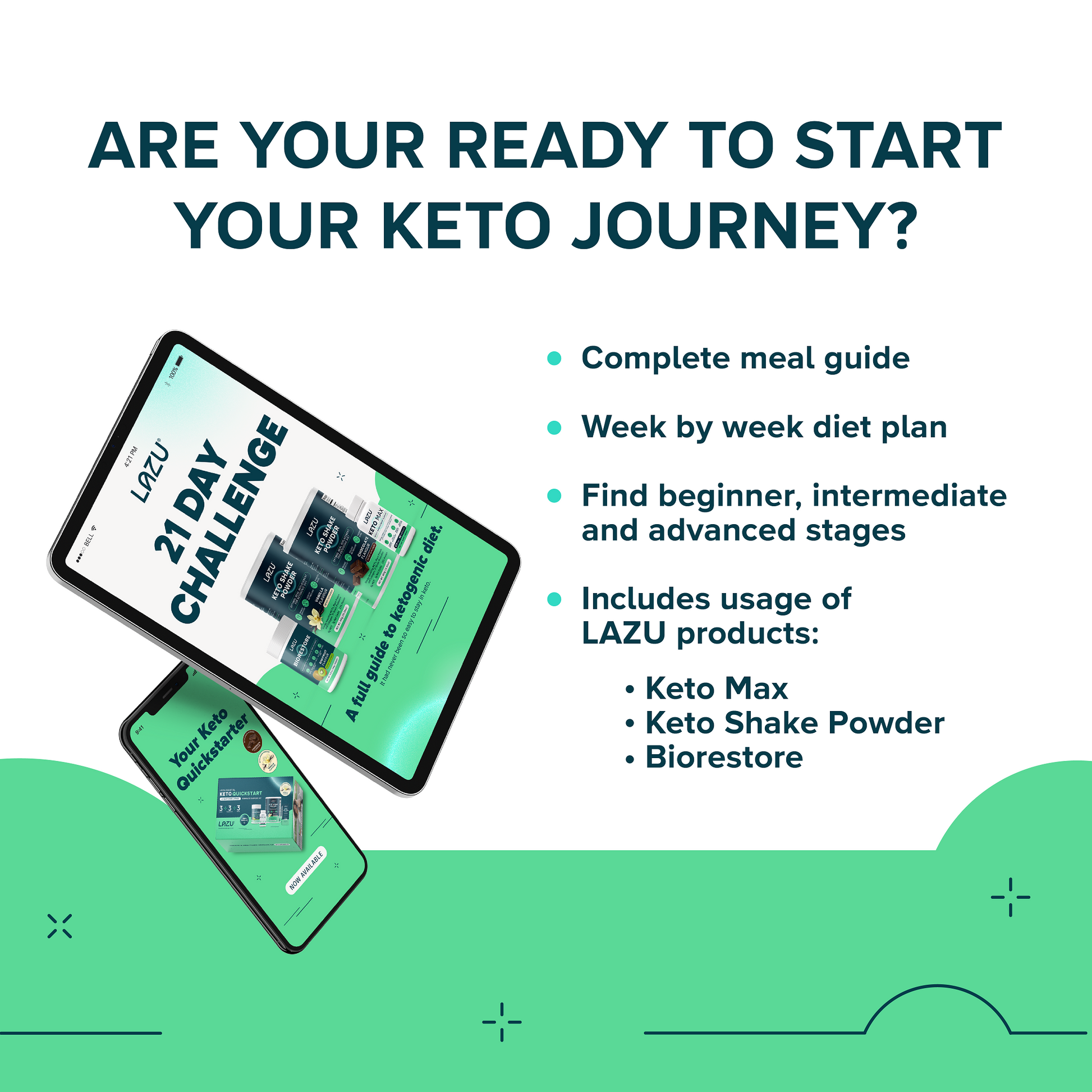 The 21 DAY KETO DIET MEAL PLAN includes a complete meal plan designed by the LAZU team for you to reach your weight management goals along with a few delicious Keto Recipes. With help of our Keto family products: Keto Max, Keto Shake Powder and BioRestore.